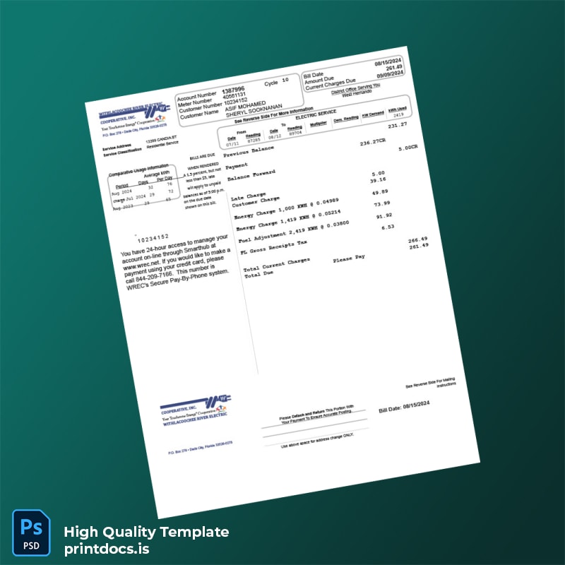 United States Withlacoochee River Electric Cooperative Inc Editable Electricity Bill Template