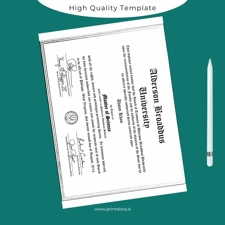 Professional Editable Diploma Template for USA Alderson Broaddus University Master of Science in Physician Assistant Studies