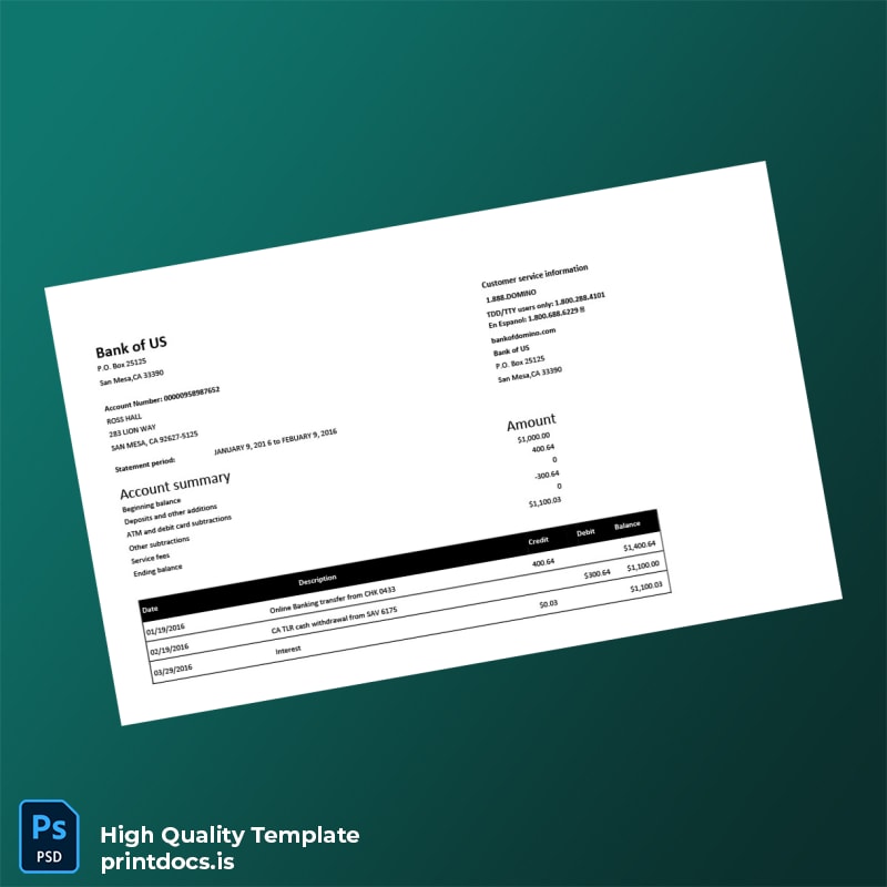 Ready to take the next step? Download the USA Bank of Us Bank Statement Template today and transform how you manage your financial documentation. For further options, check out our related products, including our 3 months bank statement PDF and our 6 months bank statement PDF. Additionally, for further validation options, visit Bank Statement Template Resources.