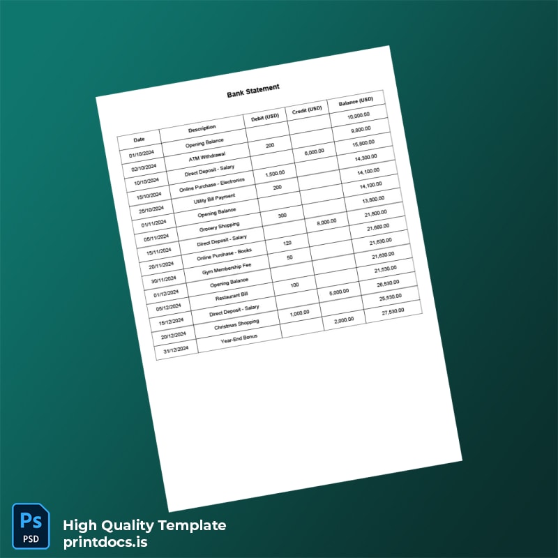 In today’s fast-paced business environment, the need for accurate and reliable documentation is critical. Whether you’ve lost your bank statement, had it stolen, or urgently need a replacement due to expiration, our USA Editable Bank Statement Template in both Word and PDF formats is your perfect solution. This essential tool enables you to create professional documents swiftly and effortlessly.