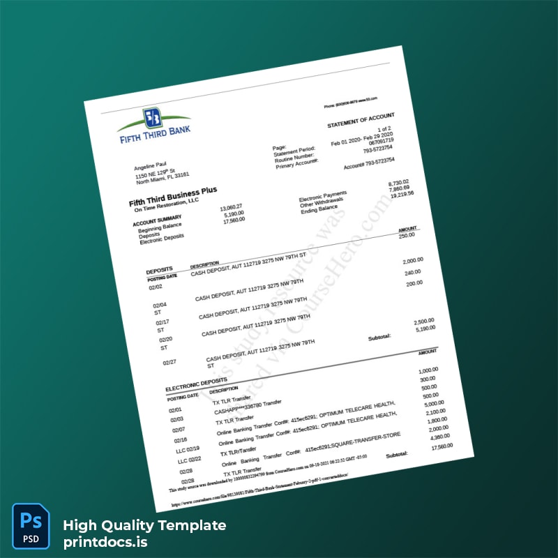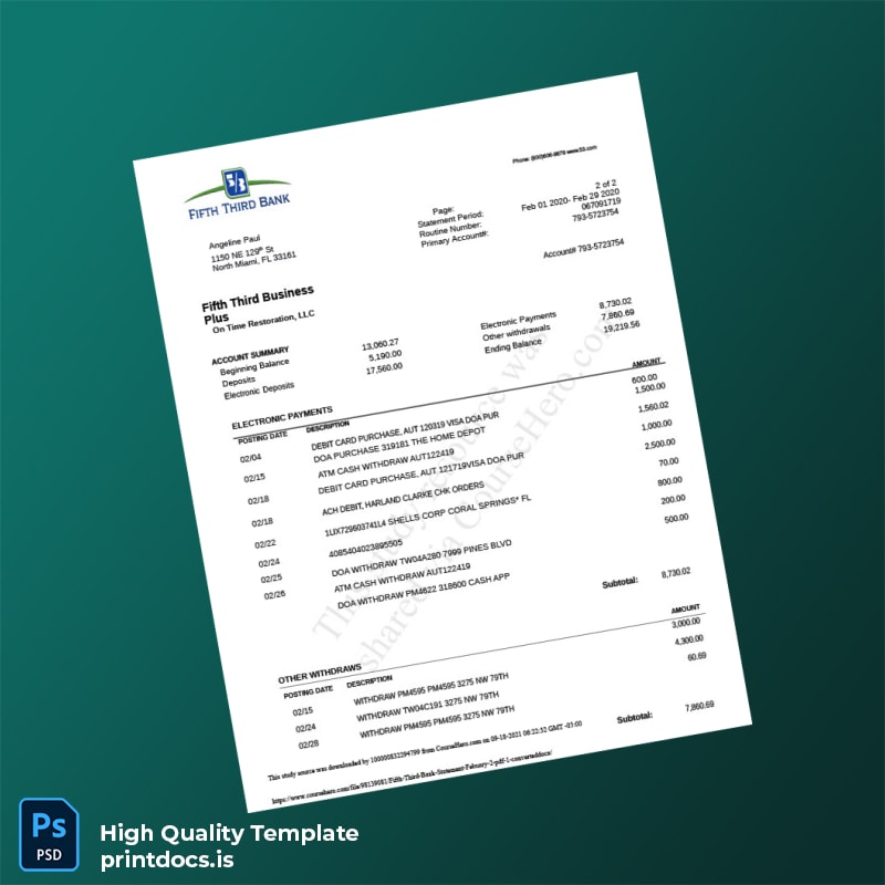 In today’s fast-paced environment, losing essential documents can create significant frustration and delays. The USA Fifth Third Bank Statement Template is here to provide a quick and effective solution for professionals who need accurate, editable bank statements in both Word and PDF formats.
