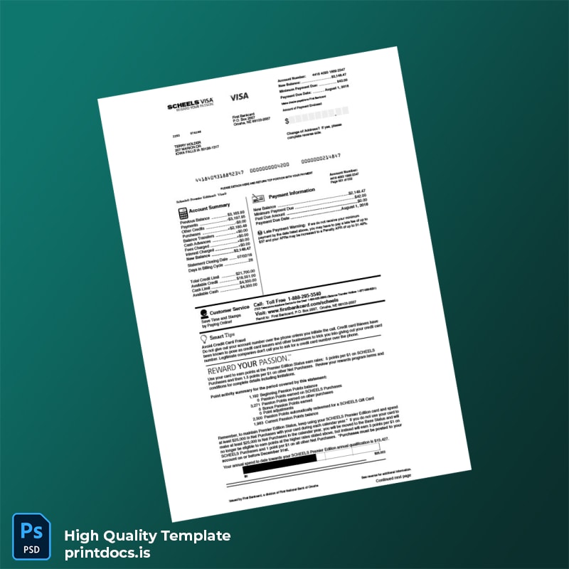 The USA First National Bank of Omaha Credit Card Statement Template is your solution for creating a professional, editable bank statement. Available in both Word and PDF formats, this template offers the versatility and quality you need to produce reliable documentation quickly.