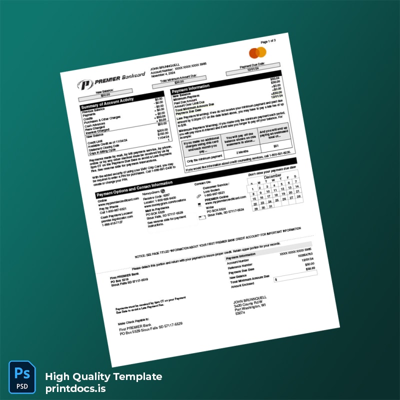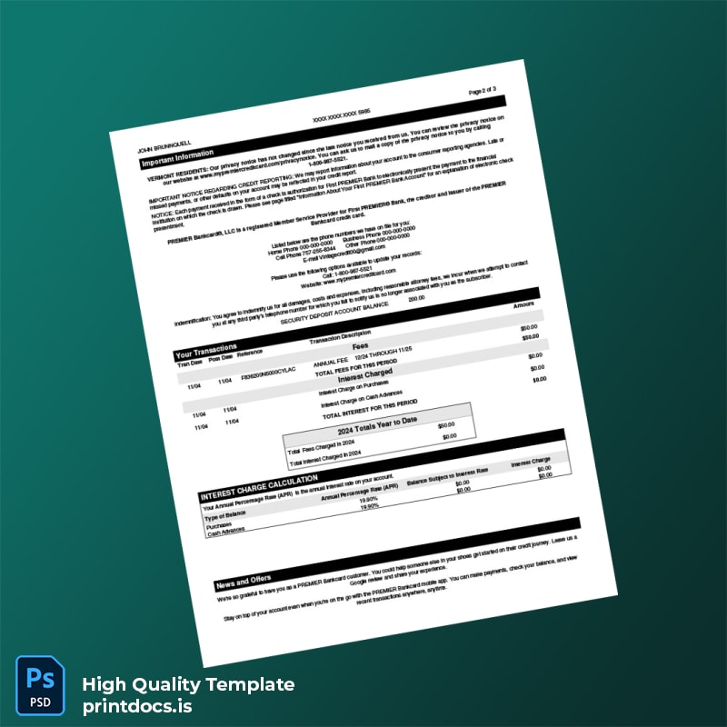 USA First PREMIER Bank Credit Card Statement Template in Word and PDF formats 3 page