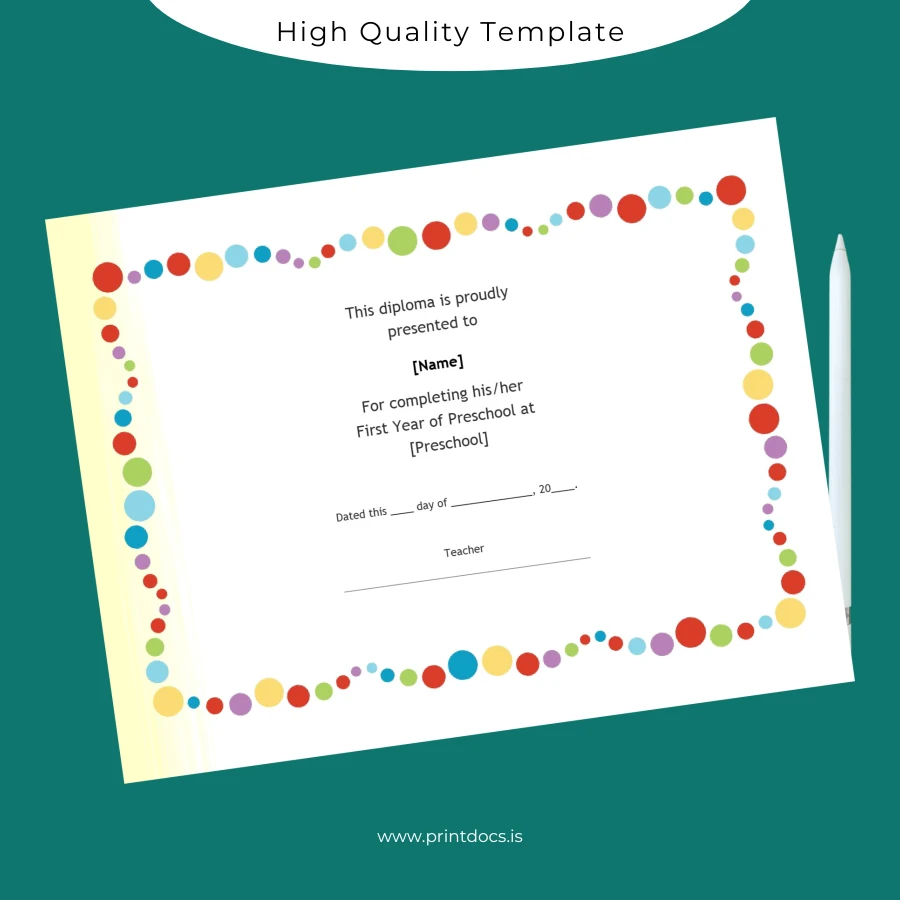 Elevate your child’s preschool celebration with a diploma that reflects their hard work and growth. Download the USA Preschool First Year Diploma Template now, customize it with your unique details, and print a stunning certificate that will be treasured for years to come. Embrace the convenience and quality this template offers and transform a simple document into a cherished memento.