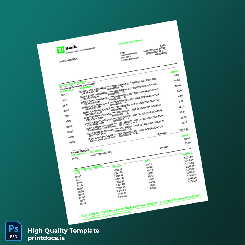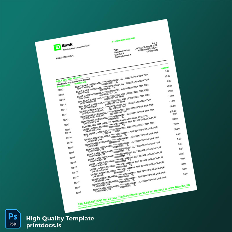 Are you in urgent need of a reliable bank statement template that you can customize without fuss? Our USA TD Bank Statement Template in both Word and PDF formats is the perfect solution for professionals who require an editable bank statement template. This template is not just a document; it is a lifeline for those needing to replace lost or expired statements quickly. Browse our complete collection in the bank statement template category.