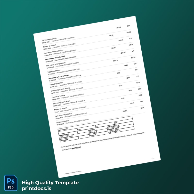 USA TransferWise Ltd Bank Statement Template in Word and PDF formats 3 page
