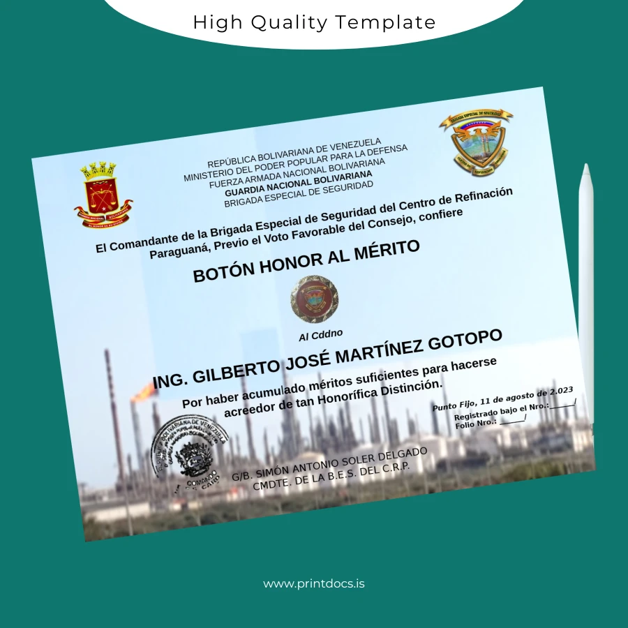 Venezuela Brigada Especial de Seguridad Honor Medal Certificate Template (Word & PDF) – Editable Diploma Template