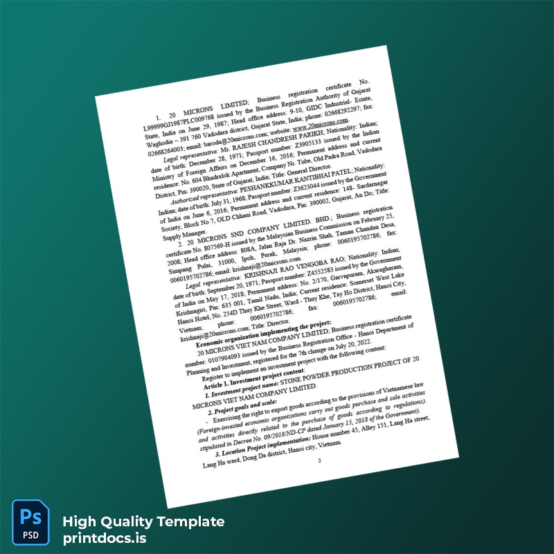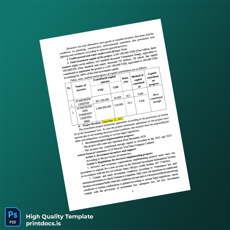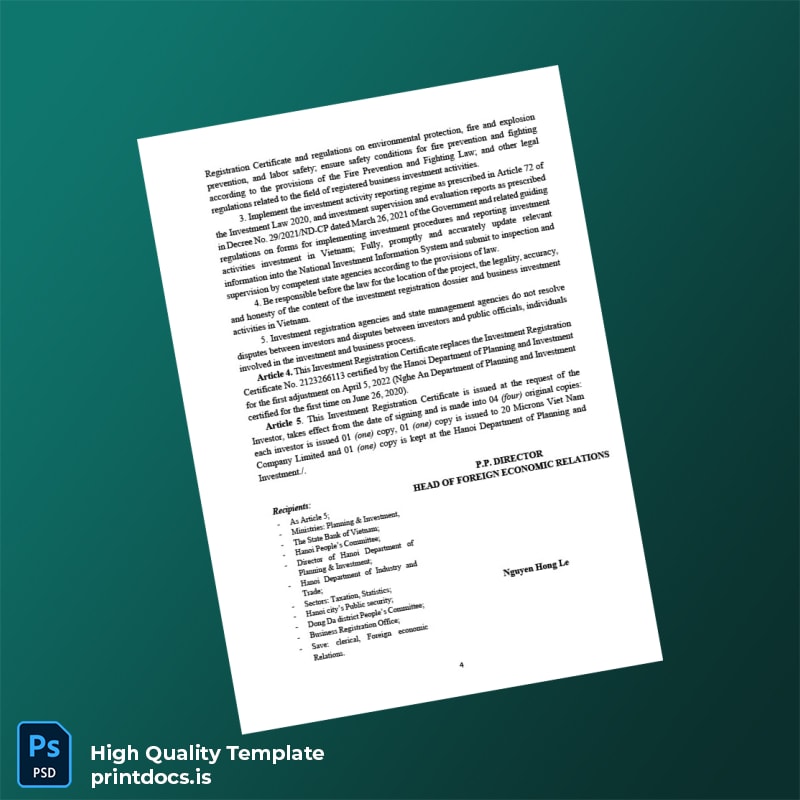 Vietnam Investment Registration Certificate Template (Word & PDF) 4 page