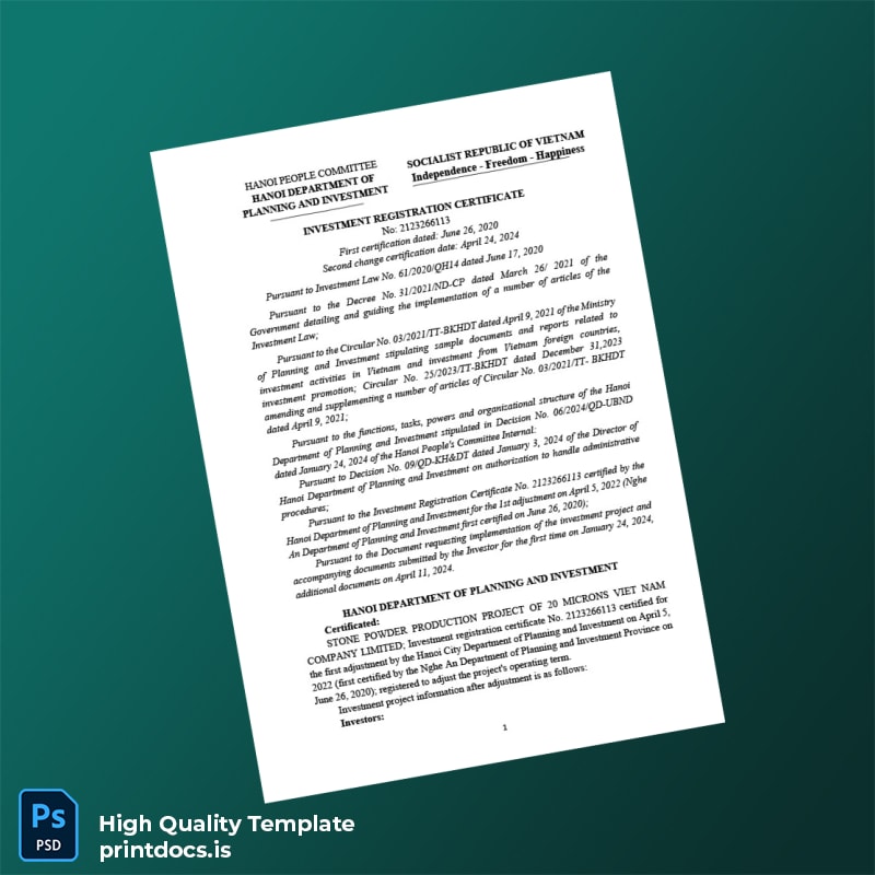 Vietnam Investment Registration Certificate Template (Word & PDF) for effortless, professional document customization and instant download. Perfect for business registration.
